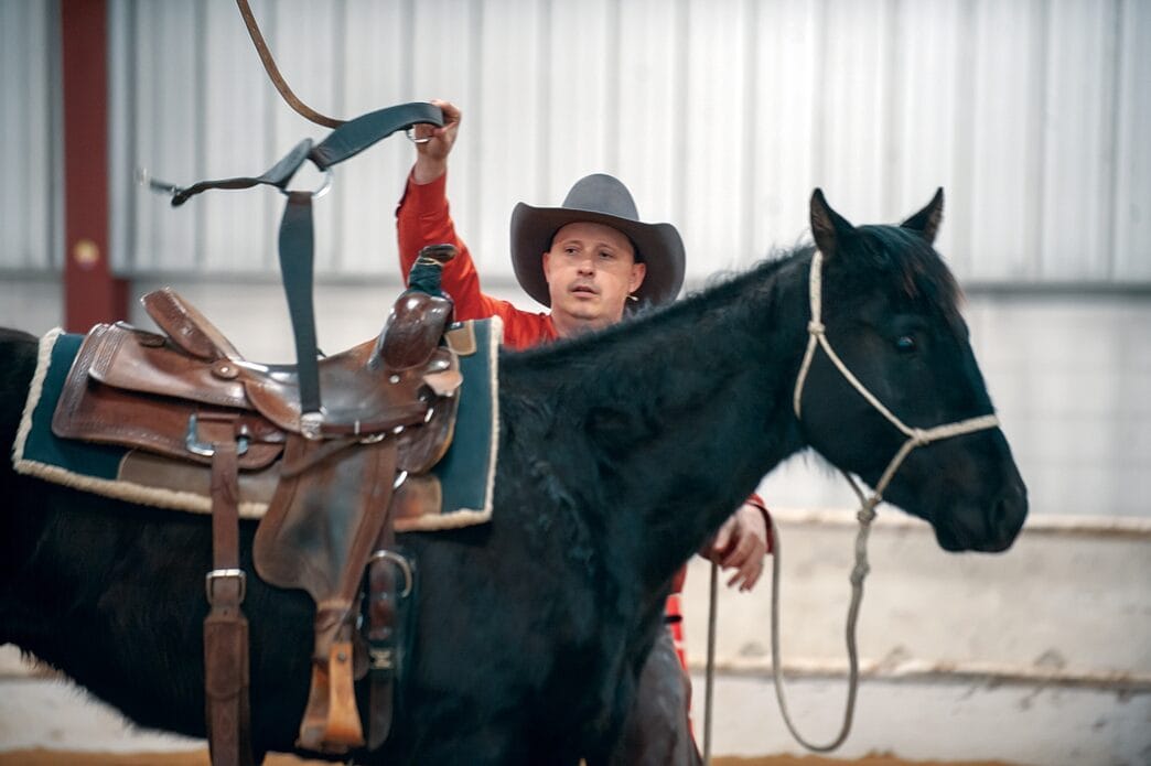 Trainer Kade Mills out of Sundre, Alta., gets Slick saddled and ready during the Everything Equine trainer challenge finals on Sunday evening. Mills ended up winning the event’s well-attended challenge.Taylor Weaver Meridian Source