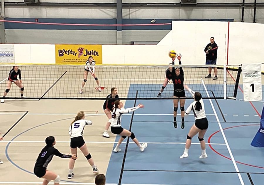 Eve Tucker wearing No. 14 with the 16U Momentum volleyball team, is pictured blocking a shot during a seasonal game. The girls are playing at the open nationals in Edmonton from May 19-21. Supplied Photo