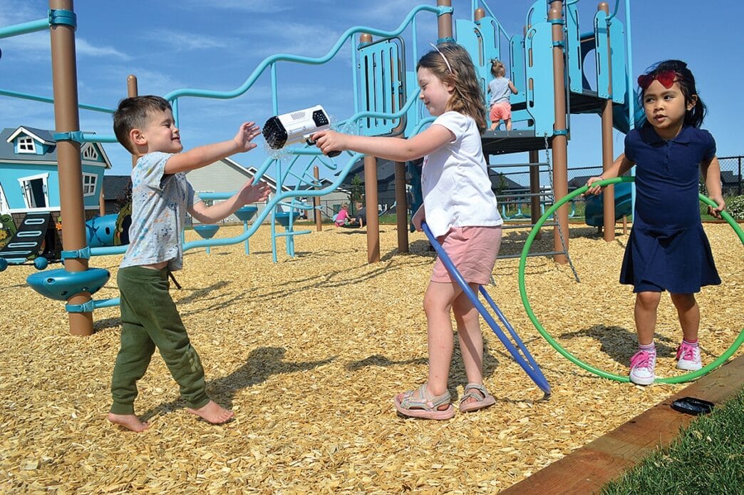Three-year-old Colter, left, teams up with five-year-old bubble shooter, Olivia, for some fun on the official opening day of Parkview Playground last week under sunny skies. Geoff Lee Meridian Source