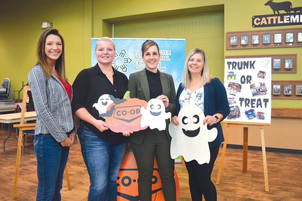 Lloyd Ex reps Jen McRobert, left, event administrator and Michayla Cole, marketing manager, teamed up with Lloydminster and District Co-op’s director of marketing and communications, Kristine Knourek, and Emelie Currie, marketing co-ordinator, to launch an indoor Halloween event called Trunk or Treat at Lloyd Ex on Oct.  27. Geoff Lee Meridian Source