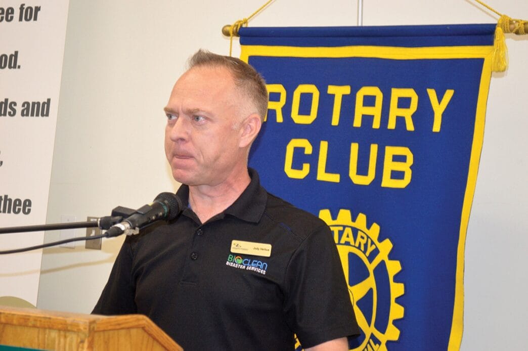 He was introduced at Rotary as the “master of disaster,” being the owner of Bioclean Disaster Services and an accredited master-certified fire and smoke, water and textile restorer.