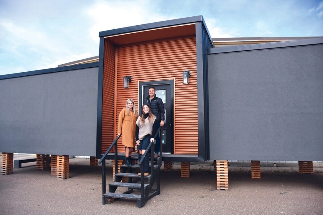 Ecoplast Solutions held a tiny house open house at its site at 4604 62 Ave. from 4-7 p.m. last Thursday to explain the use of structural panels from recycled plastic bottles. Pictured are Dana Smith, left owner of Daines and Daubney from Wainwright who staged the interior; Katlyn Wilkinson, Ecoplast design draftsman; Jean-Marc d’Entremont, Ecoplast managing partner) outside the 497 sq. ft. house built from 350,144 recycled plastic bottles. Supplied Photo