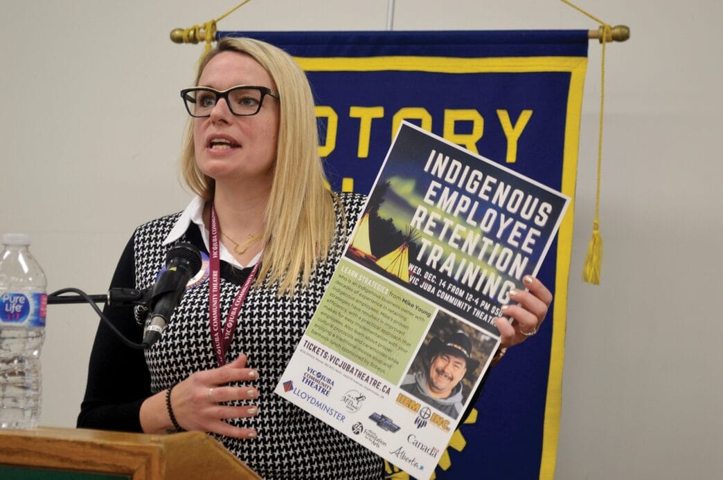 Jennifer McConnell, general manager of the Vic Juba Community Theatre, held up a new event poster during her presentation to the Rotary Club of Lloydminster on Monday. Geoff Lee Meridian Source