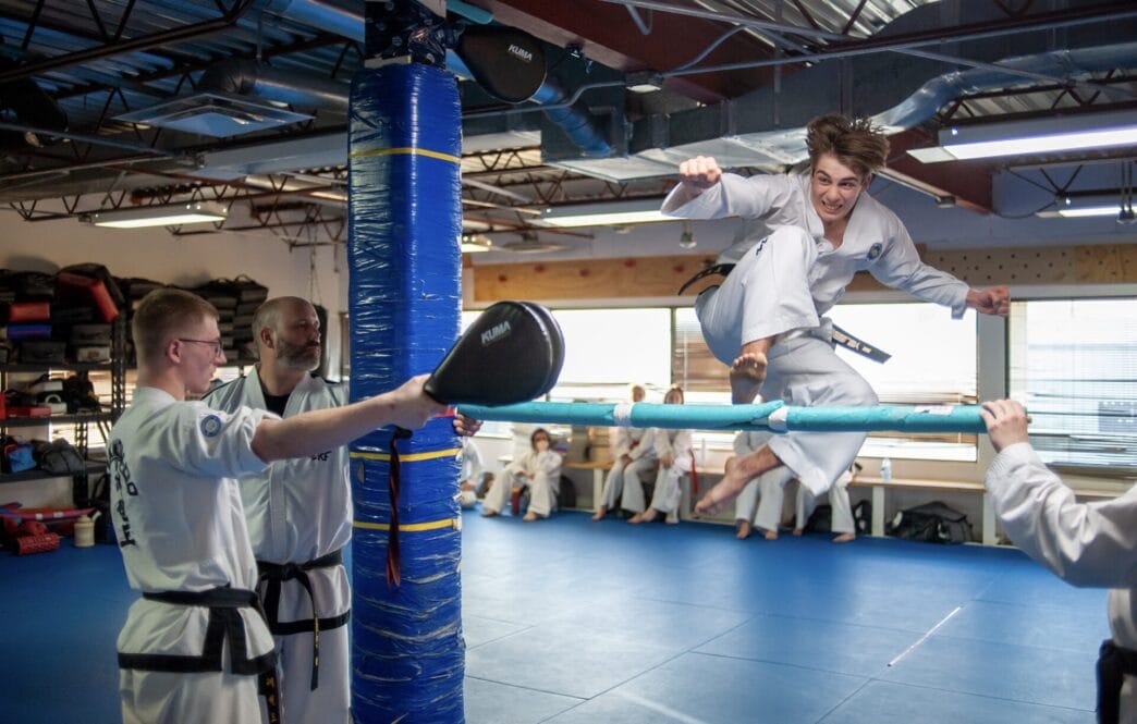 Torrent TKD’s Lucas Feeley, who recently won a national Taekwon-Do title in sparring in Vernon, B.C., is now preparing to take on the best at Worlds in Finland in September. Feeley is seen performing one of his specialty techniques at the Dojang last week. Taylor Weaver Meridian Source