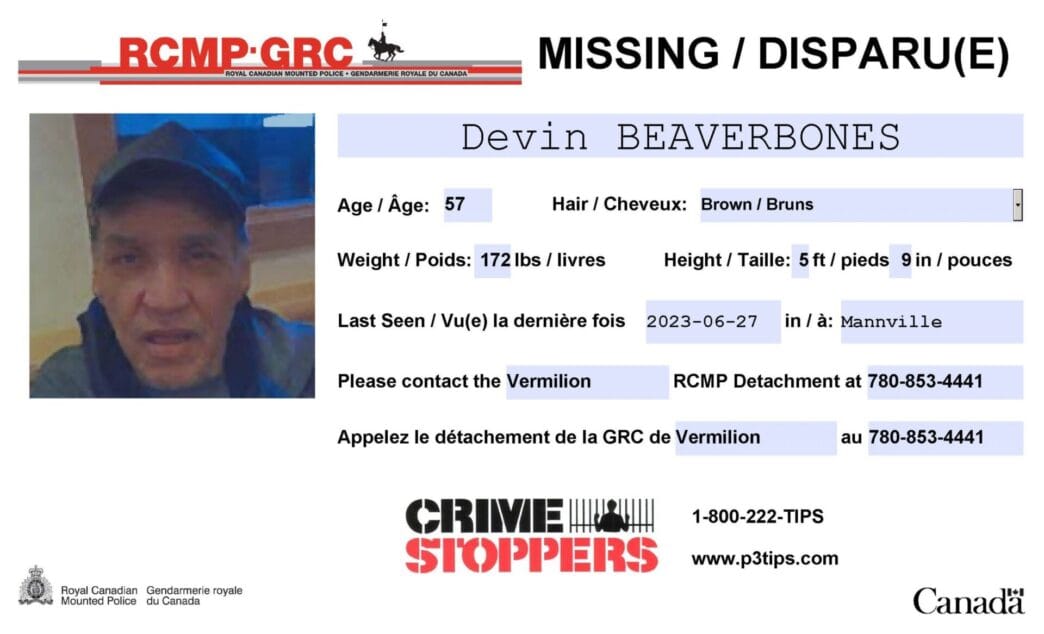 Vermilion RCMP is seeking public assistance in locating missing Devin Beaverbones, 57, a resident of Mannville. Beaverbones was last seen on June 27 at approximately 12:30 p.m., in Mannville. He has medical issues and there is concern for his safety.