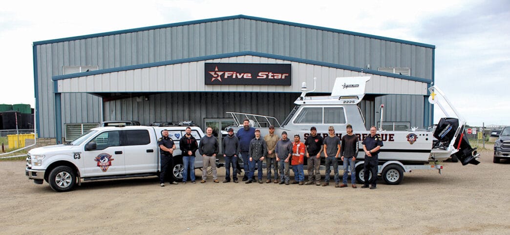 From left: Lloydminster Rescue Squad Deputy Chief Ryan LeBlanc (left), and Lloydminster Rescue Squad Chief Norm Namur (right) with the Five Star Industries team in front of the rescue boat, which was recently outfitted with custom equipment made by Five Star Industry’s employees. Jeannette Benoit-Leipert Meridian Source