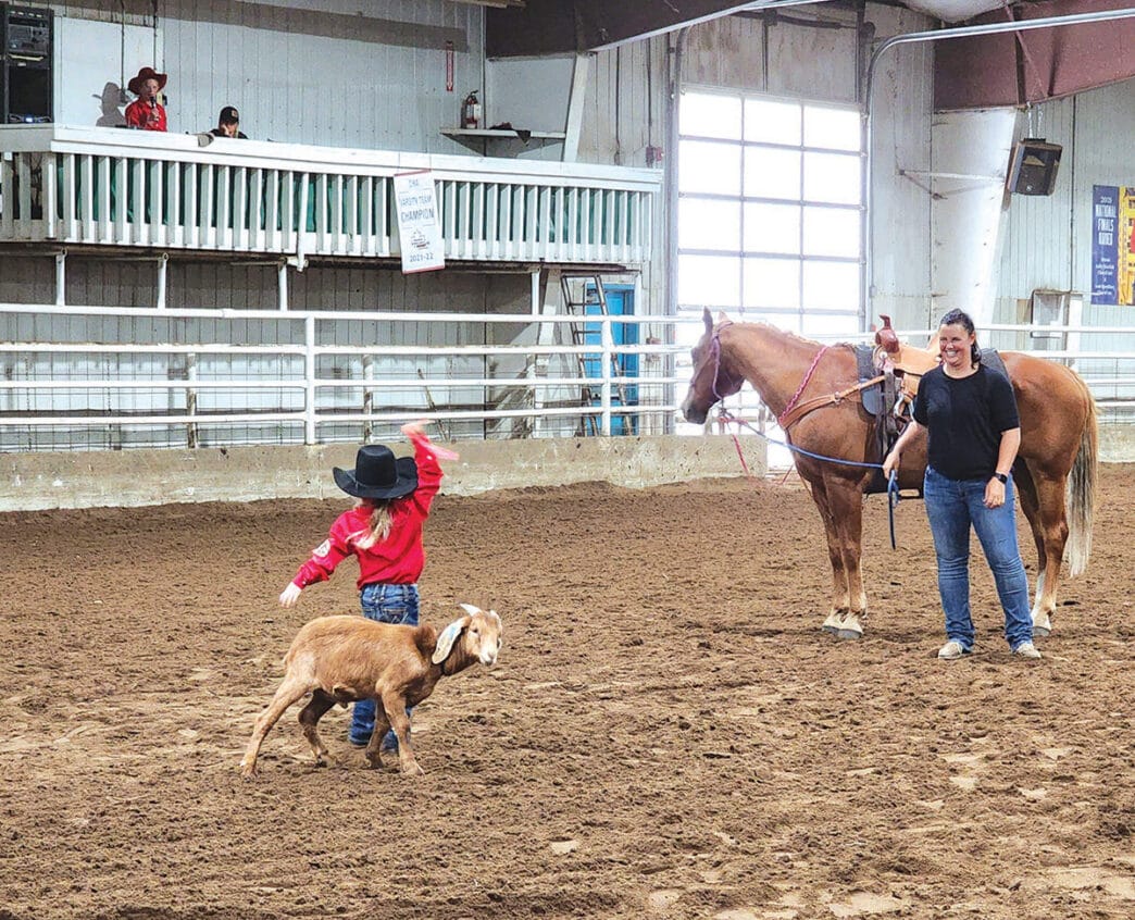 One of the littlest cowpokes waves a freshly-untied ribbon she took from the goat’s tail after riding in and dismounting her horse. The younger participants do the goat untying as a precursor to goat tying. Jeannette Benoit-Leipert Meridian Source