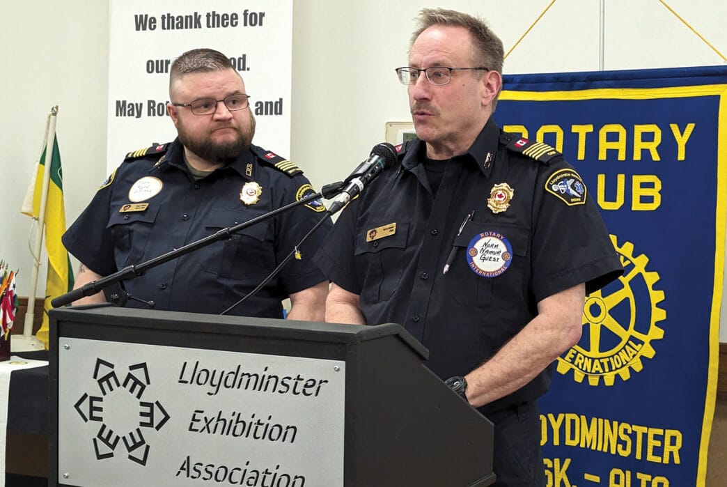 Lloydminster Rescue Squad, deputy chief, Ryan Leblanc, left, and chief, Norm Namur, launched a fundraising campaign for a new 3/4 ton truck during a presentation to the Rotary Club of Lloydminster Monday lunch. The squad has applied for a $75,000 Rotary Legacy Community Project grant, hoping to cover most of the $100,000 funding goal. Geoff Lee Meridian Source