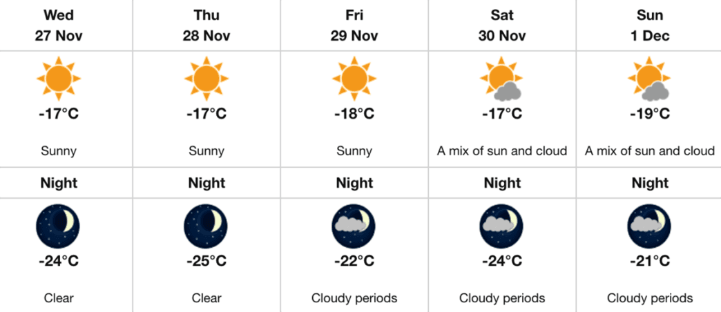Tonight’s weather is clear and a low of -24°C.