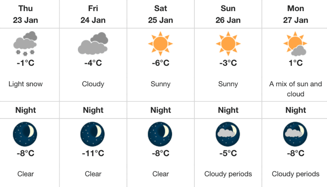 Tonight’s weather is clear with a low of -8 C.