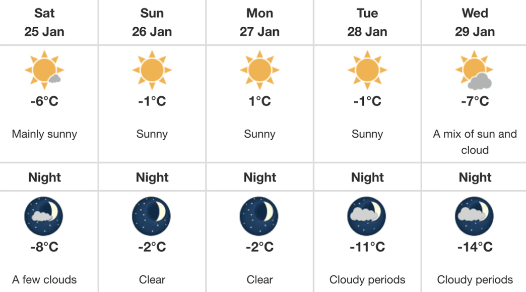 Tonight’s weather sees a few clouds, 20 km/h west winds lightening in the evening, and a low of -8 C. The wind chill, however, will near -14 C.