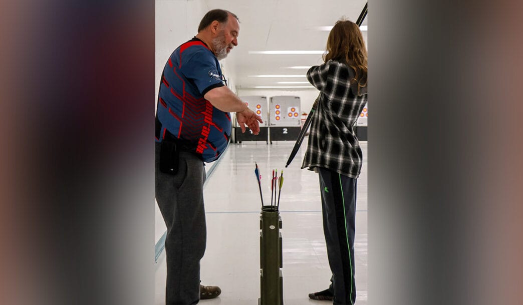 Dwayne Davison helps a student work on their archery skills. Dan Gray - Meridian Source