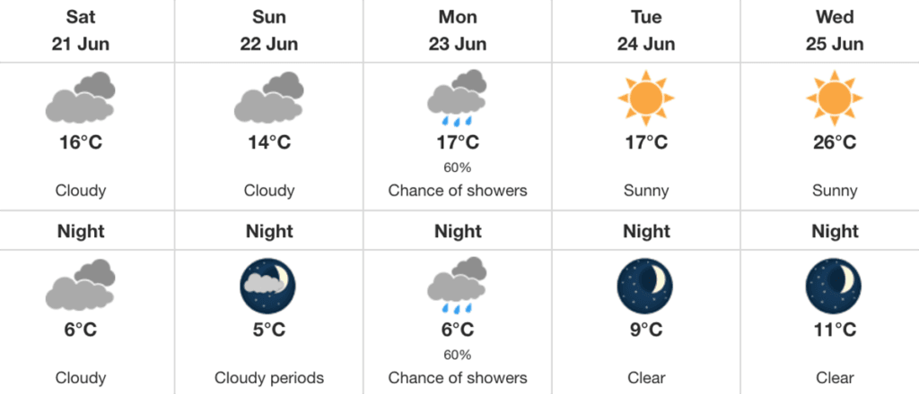 Tonight’s forecast is cloudy and a low of 6 C.
