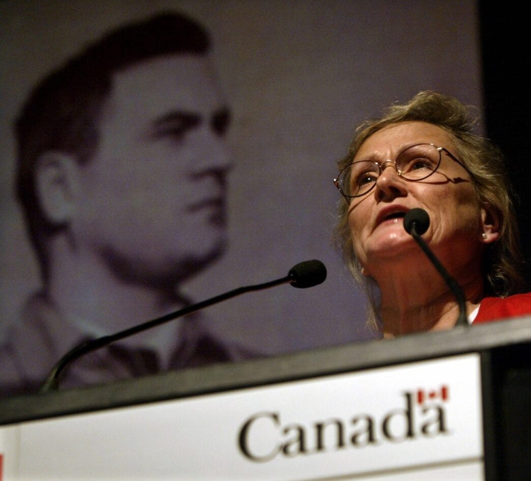 Evelyn Wilson, daughter of Igor Gouzenko, who defected from Russia in 1945 with proof of a Soviet spy ring in Canada, speaks fondly of her father below a portrait during a plaque dedication ceremony in Ottawa on Thursday, April 15, 2004. (CP PHOTO/Tom Hanson)