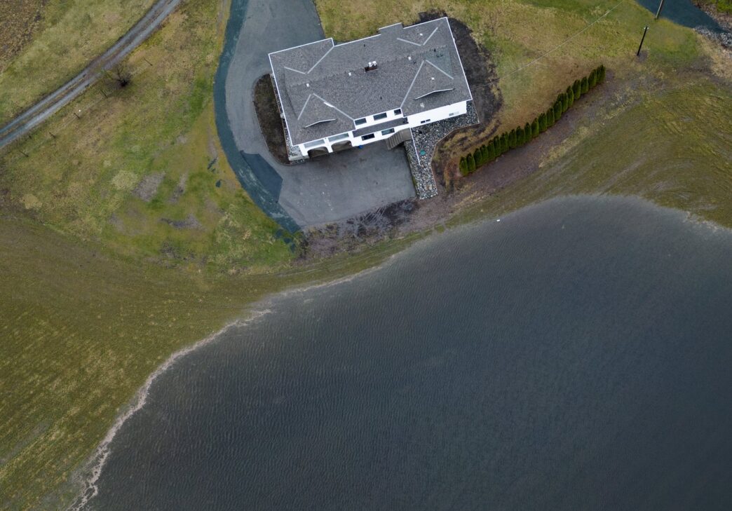 In this photograph taken with a drone; a large amount of water floods a low area of a farm near a house in Abbotsford, B.C., Wednesday, Jan. 31, 2024. A weather system with unseasonable warmth has melted snow and brought drenching rain to the province with temperatures reaching 18C in parts of B.C.'s Lower Mainland this week. THE CANADIAN PRESS/Darryl Dyck (The Canadian Press)
