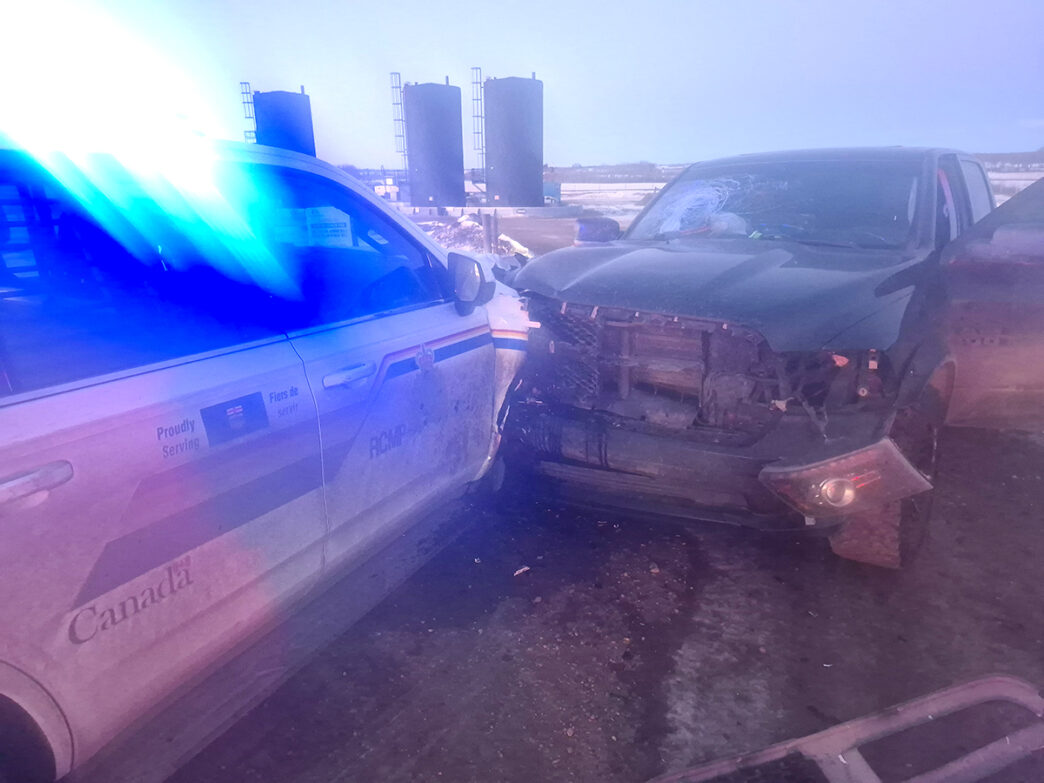 As another Kitscoty RCMP officer arrived at the residence, the stolen SUV collided with the passenger side of a moving police vehicle while backing out of the garage, police said. The suspects then fled again, narrowly missing a third police vehicle while attempting to turn north onto Range Road 14.