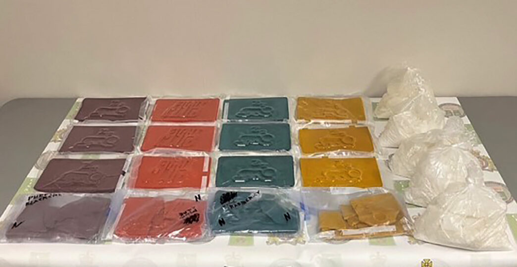 During the investigation, officers located a bag inside the vehicle containing 4.907 kilograms of methamphetamine and 4.219 kilograms of fentanyl. The drugs were seized and the vehicle’s two occupants were arrested at the scene.