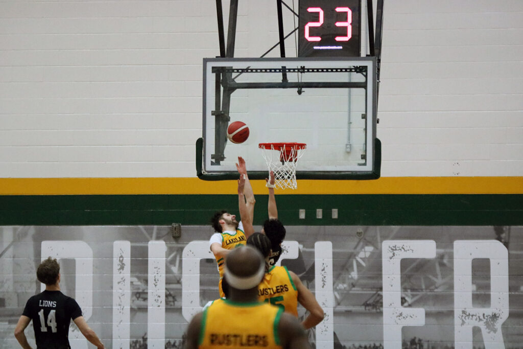 About 500 fans packed the Lakeland College gymnasium Thursday night to watch the Rustlers 93 74 quarter final win over the Ambrose Lions in opening day action at the ACAC mens basketball championship John MacNeil Meridian Source