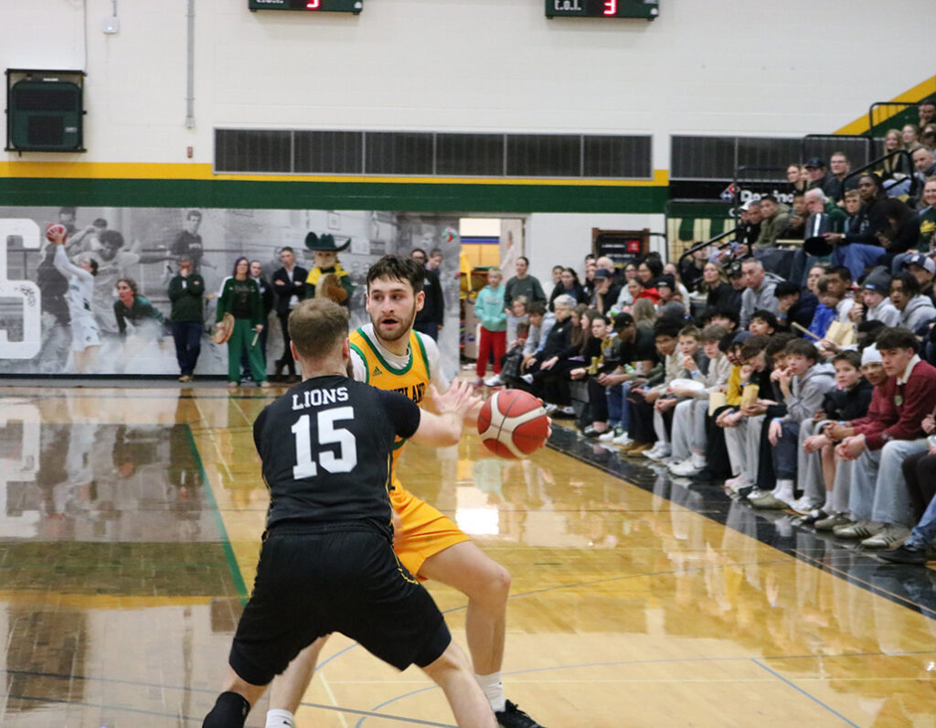 Lakeland Rustlers’ Taleh Wade, the ACAC North’s player of the year, faces the Ambrose Lions’ Jarom Walton during the host Rustlers’ 93-74 quarter-final victory Thursday night in Lloydminster. John MacNeil Meridian Source