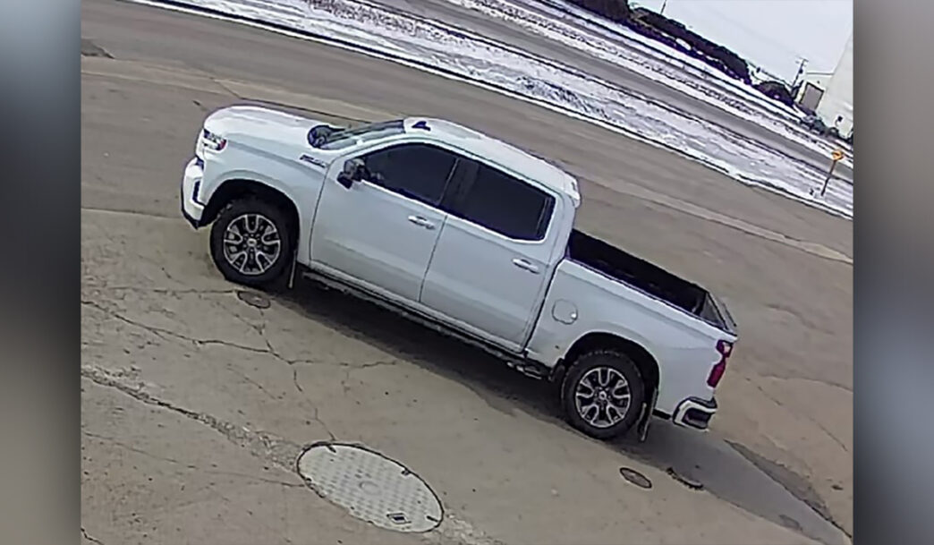 The suspect vehicle is described as a newer-model white Chevrolet crew cab with what appears to be a broken taillight. Police have released a photo of the truck.