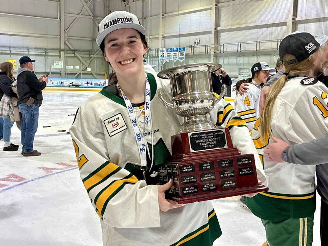 “Oh, I’m very sore,” Lammers said during the pandemonium on home ice as the Rustlers and their legion of fans celebrated a momentous 1-0 double-OT win over the Red Deer Queens in the fifth and deciding game of the Alberta Colleges Athletic Conference (ACAC) championship.