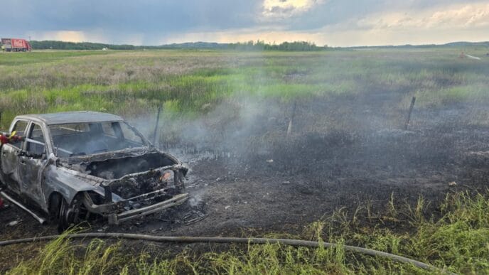 2025FeaturedFireLloydminster NewsLocalNewsCollision sparks fire outside MarwaynebyDan GrayJune 26, 2025